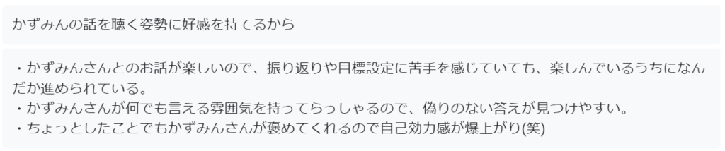 ポジティブな状態になることで、あなた自身の心の奥にある「本当にやりたいこと」や「自己実現に向けてやってみたいこと」を引き出します。また、ポジティブな気持ちで話すことで思考も整理され、より言語化しやすい状態を作ります。