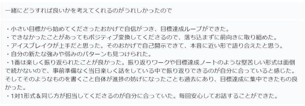 あなたの心の奥から言語化されたことなので、納得度の高い「次にやること(目標)」が明確になります。具体性が足りない場合は、問いを投げかけます。進める上で不安な部分についてお話しいただければ、解決に向けてのサポートも可能です。